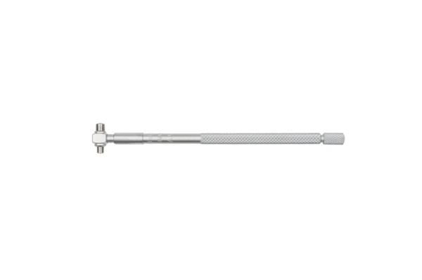 Переводной калибр Mitutoyo, позволяющий измерять диаметр отверстий, расточек или канавок с помощью внешних микрометров или штангенциркулей. В процессе работы подпружиненный плунжер расширяется в пределах измеряемого элемента, а затем фиксируется на месте с помощью рифленого поворотного регулятора на конце рукоятки. На практике необходимо выполнить некоторые манипуляции, чтобы убедиться, что минимальный размер зафиксирован, после чего калибр осторожно извлекается, чтобы можно было измерить размер по контактным поверхностям.
