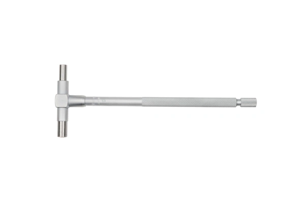 Переводной калибр Mitutoyo, позволяющий измерять диаметр отверстий, расточек или канавок с помощью внешних микрометров или штангенциркулей. В процессе работы подпружиненный плунжер расширяется в пределах измеряемого элемента, а затем фиксируется на месте с помощью рифленого поворотного регулятора на конце рукоятки. На практике необходимо выполнить некоторые манипуляции, чтобы убедиться, что минимальный размер зафиксирован, после чего калибр осторожно извлекается, чтобы можно было измерить размер по контактным поверхностям.